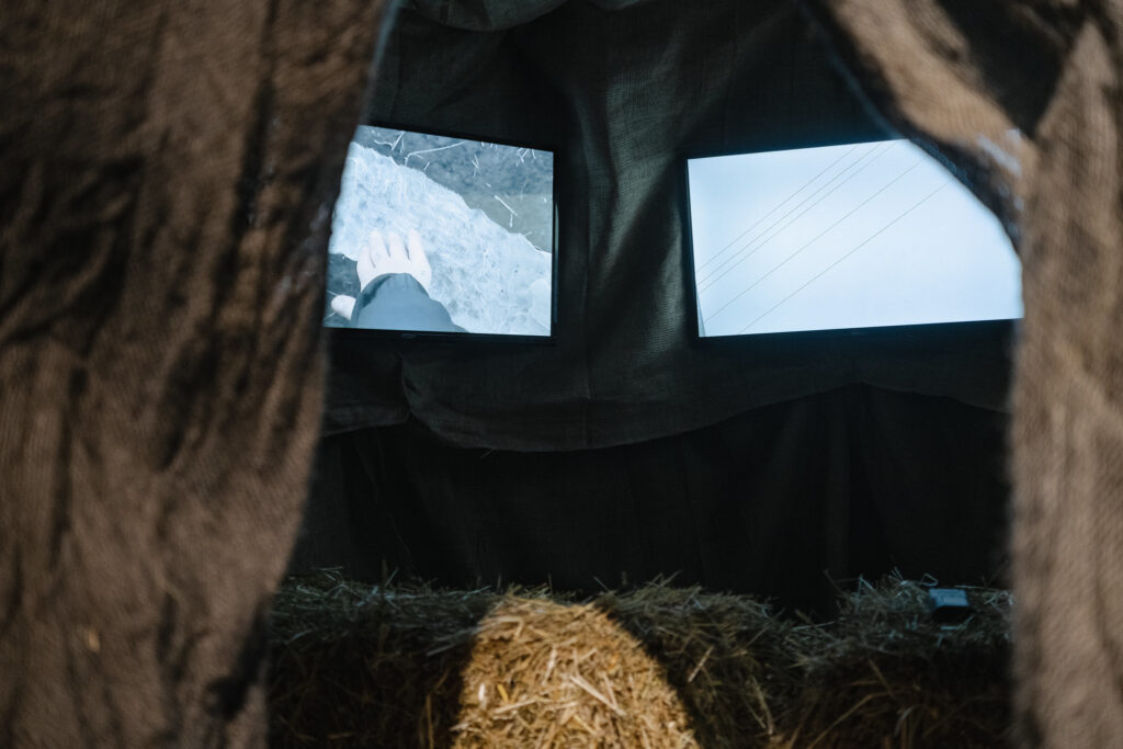 I suffer from hayfever, so I wasn’t able to enter Kurgans, Tombs and Us by Oksana Pohrebnnyk, Zhenya Milyukos, and Anna Ivchenko. I kneel at the burlap yurt’s threshold. A pungent, warm atmosphere emanates from two hay bales on the ground inside, positioned intimately like benches in front of three screens that alternately display wintry landscapes — trips to a kurgan (an ancient burial mound), apparently — and snippets of white sans serif texts on a black background. In one extended video segment, tattooed hands spread white gauze on the frosty clotted soil of an agricultural field. The gesture touches a pre-memory suggestion of burial. Because I can’t fully immerse myself inside this work, I find myself kneeling among it and other works, inside the curators’ spatial arrangement of disparate ideas that form a whole. To my left, out of the corner of my eye, a small concrete stela by Marta Dyachenko balances brutally. In the corner of my right eye, the pink and blue triangles of Sasa Tatic’s Flow look shrill and sickly. And behind my ears, the sound of Pavlo Kovach swabbing blood off the inside of a military truck reverberates hollowly.