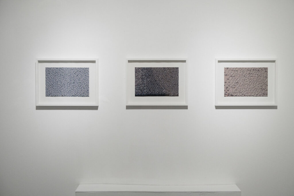 The piece works as a kind of diptych with Mandy Knospe’s 27/08/18, a set of three a4 prints on the side wall, or at least the works offer each other mutual thematic support. Here the rightwing drift of the European political landscape is visualized in patterned digital collages using source images of anti-immigrant demonstrations in Chemnitz in 2018. Like in Chychkan’s work, the period addressed is already historical, but also uncomfortably contemporary. The 2018 event was no doubt part of the broader anxiety produced by the AfD’s rise (the party won seats in the Bundestag for the first time in 2017), and also the moment when Europe was becoming (or refusing to become) aware of russia’s concerted destabilization efforts against its western neighbors through hybrid tactics and information war. Timothy Snyder’s The Road to Unfreedom, published the same year, details russia’s malicious efforts in several countries, both successful and unsuccessful. Seven years on, the event Knospe explores could indeed be said to have multiplied, like her collage. Political developments have gone beyond troll armies and Kremlin handouts to right-wing candidates and turned into authoritarianism riding on the back of cynically populist victories across the world.