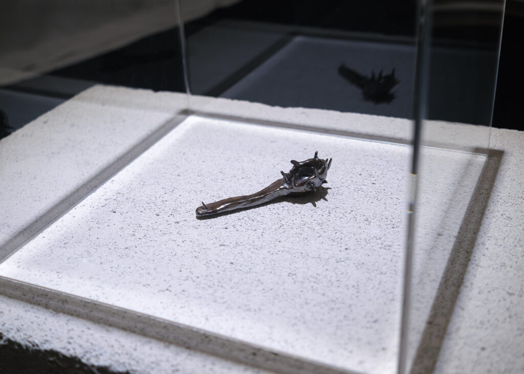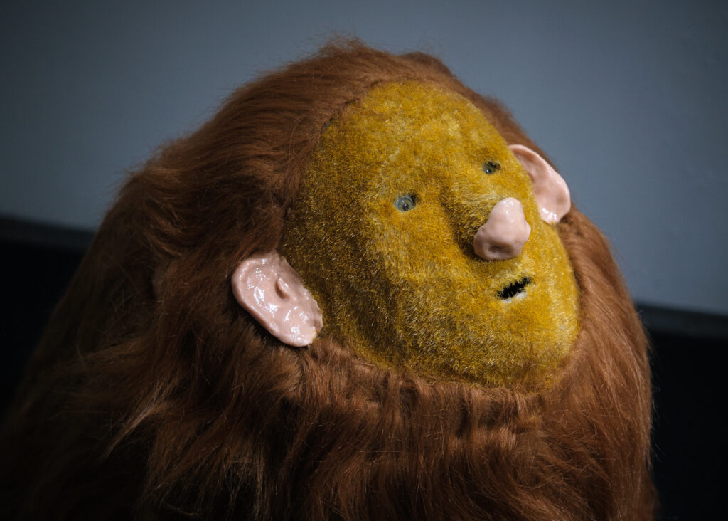 Nearby is Poor You by Elke Biesendorfer, a glazed ceramic baby spoon covered with spikes. Just as I can’t help but see Sirko as the Humanpigdog, I can’t help but worry that this will be the only feeding implement available to Buchatska’s protagonist when she finally gives birth. Grouped with Buchatska, the spoon becomes another comment on birth, childhood, future generations, or, the future more broadly. While this might have a different meaning in, for example, a show about nostalgia for our own childhoods’ in the past, here the childishness asks: what is the world these children will be born into, and what is the future world in which they will grow into adulthood? For this exhibition, that future feels decidedly dark. But, maybe this is also an image of adaptation, of plenty—this warped spoon might be appropriate for the mutant mouths of the children of that dystopia.