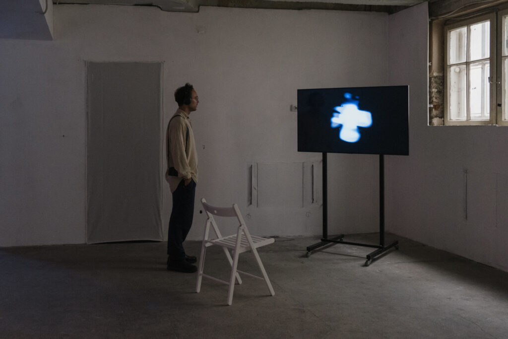 The invisible diagonal of Flow and o.T. specifically cuts across the other two works in this space, Bela Bender’s +/- and the aforementioned Kurgans, Tombs and Us. I must admit, apart from my more physical reaction to the work of Pohrebnnyk, Milyukos, and Ivchenko, my Ukrainian is not good enough to work through the piece meticulously, since it relies to some extent on text that appears to quickly on screen for my slow eyes. But the axis it shares with Bender’s work, x-ing across the invisible diagonal of Tatić and Dyachenko, is fortunately only weighted by text from one side. +/- is also a video work, an endless loop showing the surface of dark water reflecting a white light switching from + to –, as vibrations ripple the surface. The text notes that the artist wanted to comment on the use of “+” (and the world “plus”) by Ukrainian military to mean both “affirmative” and general enthusiasm, as well as its percolation into the broader culture of digital messaging, in particular its use to express satisfaction with content depicting deaths of the invaders. This makes some sense, especially considering the active merger of techno club aesthetics with military imagery in Ukraine. We’re reminded that the work’s slickness is just as incongruent as the seductive techno sheen always is when superimposed on the messiness of war. The fact that the work touches on this discomfort, knowingly or not, is a good thing.