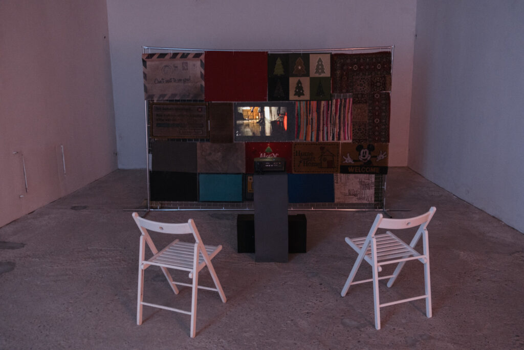 Together these elements speak about the two brothers, inhabiting the two extremes currently available to men of military age in the country. This creates a work that is uncomfortably about them rather than the symbolism and performance of its composition. Within the Ukrainian art scene, conversations around male artists who have left the country and those who have been mobilized are so dense they cannot be printed, making the experience of the majority of viewers of the work non-transmissible. Layers of circumstance, choice, guilt, and consequence exist in both paths, and sink far deeper than the status updates that reach the eyes of a broader international audience. On that surface though, we can see this dense and tangled work, which discusses refugees and conscripts in the same breath. The repetitive motion of Pavlo’s scrub brush isn’t mirrored only in the feet wiped on Danylo’s welcome mats, it falls in and out of sync with Bender’s pulsing +, and Pohrebnnyk, Milyukos, and Ivchenko’s looping history. Together this produces the real difficulty with Tatić’s “return”. When she speaks of return in this room, or in this exhibition, what is she actually referring to? Her biography helps us—she is Bosnian, born in 1991—but it is still difficult to make sense of her words.