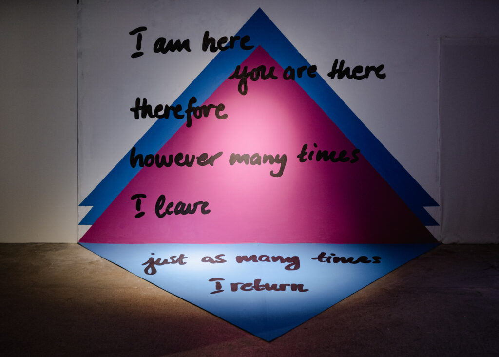 The first thing we see on entering is Flow by Saša Tatić, a mural of text with pink, white, and blue triangles. The text reads, in English, I am here / you are there / therefore / no matter how many times I leave / I return just as many times. Just as the bright colors of the piece stand in contrast to the muted and dark character of the other works, the ambiguous message seems to contrast the more dismal outlook of the show. It brings to mind Kira Muratova’s 2012 film Eternal Homecoming [Вічне повернення], sometimes called Eternal Return. The film is structured as a series of repeating screen tests, working through the same lines over and over again (in russian, which itself seems like a place difficult to return to now), to unsettling effect. The prospective pleasantness of Flow reads better for me in the space with this reminder of how repetition can turn to unreliability, tension, interpersonal strife. This subjective reading helps me grapple with the work’s opacity. I am grateful to Tatić for bringing colors, even if I see their liveliness as somewhat deceptive.