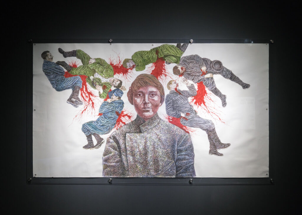 I started with Kurgans, Tombs and Us because it made me physically feel the whole of the exhibition. However, if we assume the exhibition wall text is the start of the narrative, this piece is in the second half of the show, and we should start at the beginning. The first room, with dark grey walls and low light, contains only two works. Across from the wall text we are confronted with Maria, a large-scale watercolor painting by the late anarchist artist Davyd Chychkan, from his During the War series. The war in question is not the current Russo-Ukrainian War, however, even though it was already two years into its proto-form when the work was made in 2016. The drawing depicts the large face of a woman, Maria, gazing at us from in front of a composite bloodbath— World War I anarchists, executed variously and brought together here by the artist. As with so much in this exhibition, the image’s background context is chilling. Chychkan was killed just two months ago on the front line. While he was a frequent fixture in exhibitions previously, his presence seems more essential now. This follows a tragic script—the rush to show Marharyta Polovinko’s works after her death last spring, the ubiquity of Artur Snytkus’s face in Kyiv’s art spaces—each posthumous celebration of an artist and their impact on their community is notable and powerful. It is right to honor the dead, it is right to praise the heroes whose lost lives allow this gallery to still stand. What better place to hang their works?