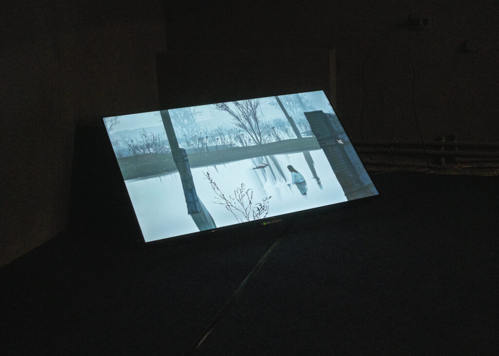 Facing Chychkan’s Maria, is Katya Buchatska’s video Water Proof. The work is a suffocating emotional trap disguised as a trailer for a videogame. The faux-game’s protagonist, a pregnant woman, spends most of her time facing away from us (and away from Maria). It feels like she is hiding her face, but if she is, it is an emotion beyond shame. This may be less of an artistic choice and more a quirk of the form—the dynamics of a first person open world video game—but her occulted bodily orientation closes whatever gulf there might be between shame and the unglamorous business of survival. In Water Proof, we find that the two are not so distant, just like facial expressions of agony and ecstacy.