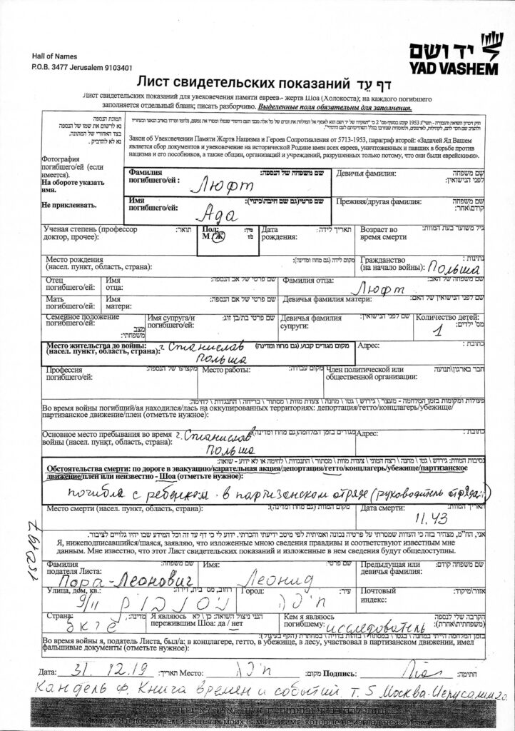 Свідчення про Анду Люфт у Яд Вашем. Джерело: http://collections.yadvashem.org/