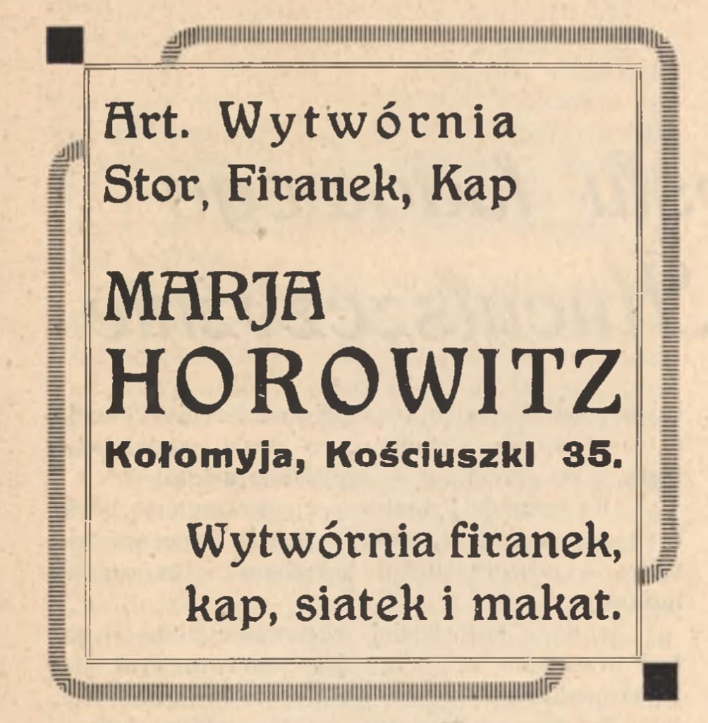 У довіднику «Rocznik Polskiego Przemysłu i Handlu» за 1936 рік вказано, що Марія Горовіц заснувала в 1924 році у Коломиї на розі вулиць Франка та Театральної фабрику штор і фіранок. Фабрика була внесена в державний торговий реєстр рішенням Окружного суду в Коломиї лише 10 січня 1934 року. За свідченнями Василя Нагірного, сама власниця та її родина мали своє підприємство та помешкання на третьому поверсі триповерхового будинку.