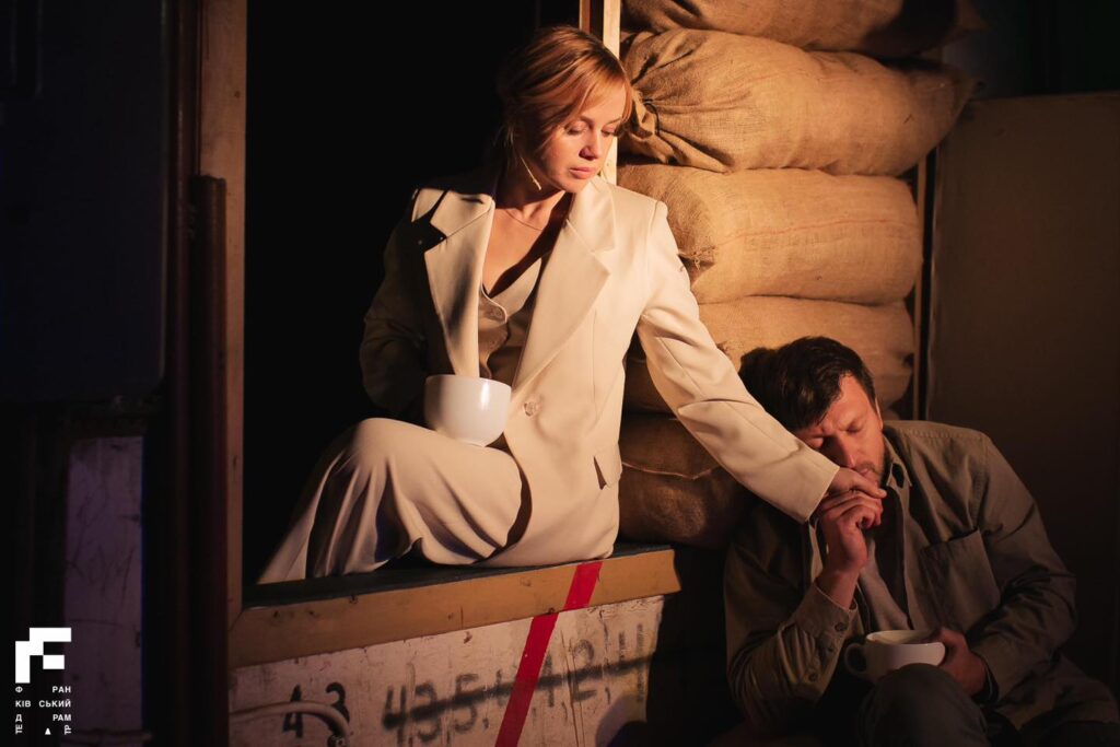 «Дім, де говорять уламки» грають у підвалі Драмтеатру. У виставі події також відбуваються серед іншого у підвалі київської багатоповерхівки. Нам показують двох військових, Женю (Євгеній Холодняк) і Філа (Ігор Захарчук), та психологиню Олену (Ірина Онищук, яка, до слова, поза сценою теж є психологинею). Ці троє дружать. Підвал багатоповерхівки колись був місцем їхніх тусівок з фільмами і музикою, а тепер Олена облаштувала його камерою і приходить туди розмовляти, записуючи все на відео. Психологу теж потрібен психолог, лунає потім зі сцени. Ну так, і це є базовою річчю. Сюди, у підвал, приходить Філ, коли приїжджає у відпустку. Він і Олена — закохані.